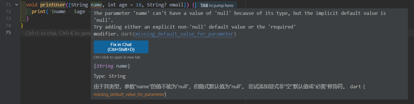 printUser(name: '赵六'); // 赵六 - 18 - null直接定义参数会报错: