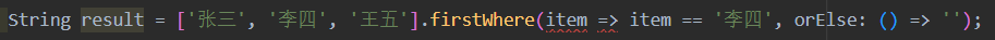 String result = ['张三', '李四', '王五'].firstWhere(item => item == '李四', orElse: () => '')